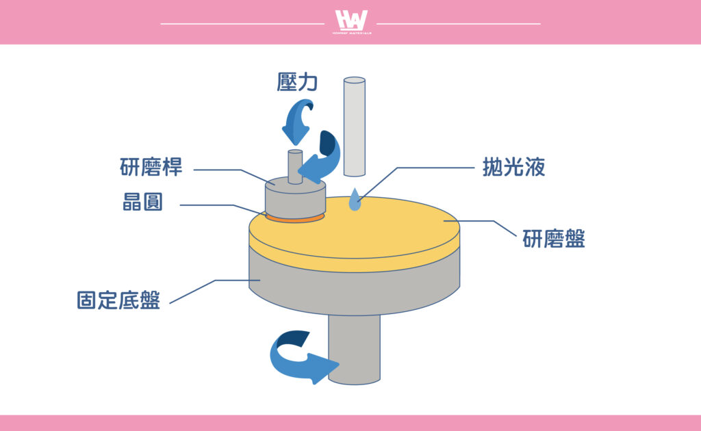 - 宏崴精密晶圓研磨拋光墊 (Polishing Pad): 配合不同類型的拋光液(Slurry)與下壓壓力,移除晶圓表面多餘的材料,如氧化層、介電層(ILD)、金屬層,如 Cu、W等,確保製程穩定。