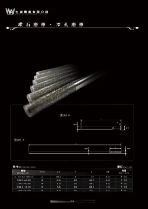 鑽石銼刀,鑽石雕刻針,陶瓷法,樹脂法,塘孔磨棒,穿孔磨棒,銼刀,鑽石磨棒,氮化硼磨棒,電鑄法,電鍍法,深孔磨棒,內孔磨棒,角度型磨棒