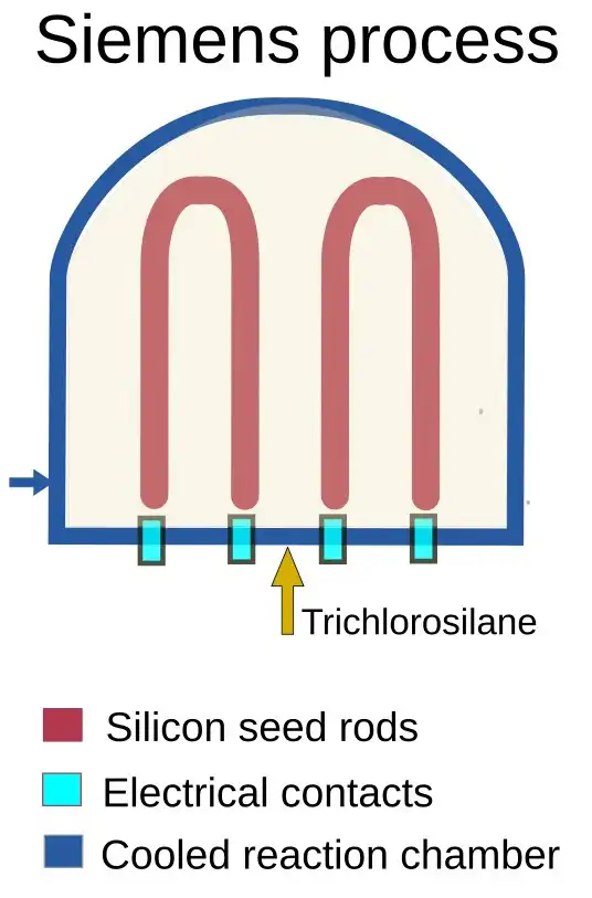 为了进一步得到99%以上的纯度,需要将MG-Si经氯化转成三氯矽烷(SiHCl₃),再透过西门子法(又称化学气相沉积 CVD)在一个密闭的钟罩型反应炉中,将三氯矽烷加热至约1,100°C,使其气化。经由高温环境中的还原反应,硅元素从气体中释出,并缓慢沉积在加热棒或炉内表面,逐步形成结晶结构稳定、杂质极少的高纯度多晶硅。这种制程可达到11N等级(纯度高达99.999999999%),这段技术自1950年代由Siemens和Wacker开发,现今占全球电子级多晶硅超过75–90%市场份额,纯度可达电子级的10N至11N 99.999999999%),犹如把黑糖炼到超洁净的白砂糖。
